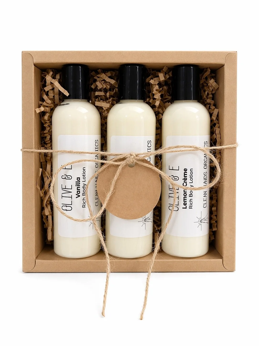 A trio of 4 oz Olive & E Lotions designed to hydrate, soften, and protect the skin throughout the day.